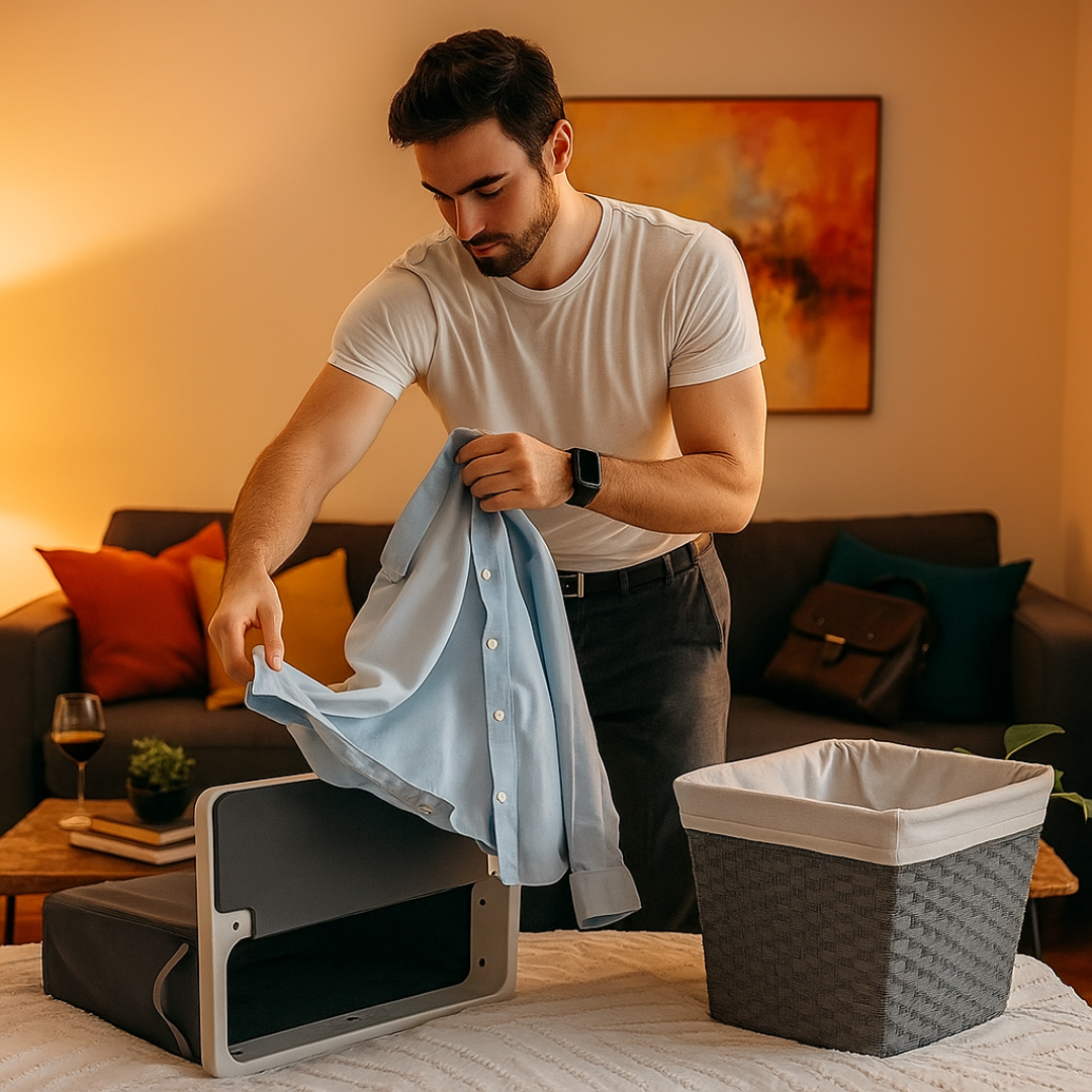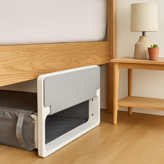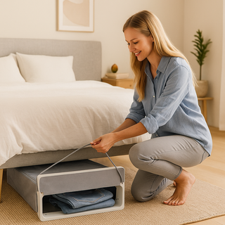 De WasGenie™ past moeiteloos onder je bed, zodat je kamer altijd georganiseerd en stijlvol blijft.